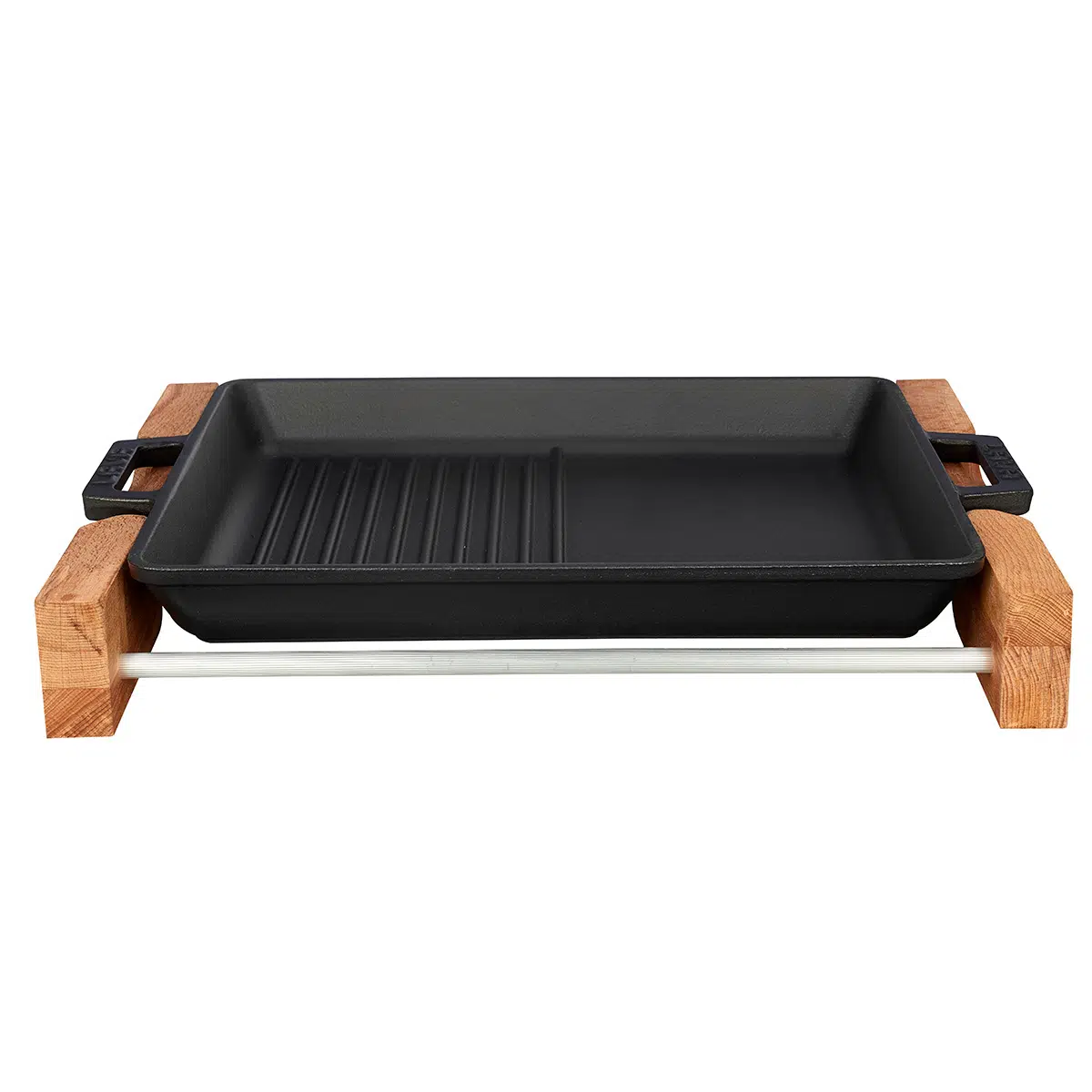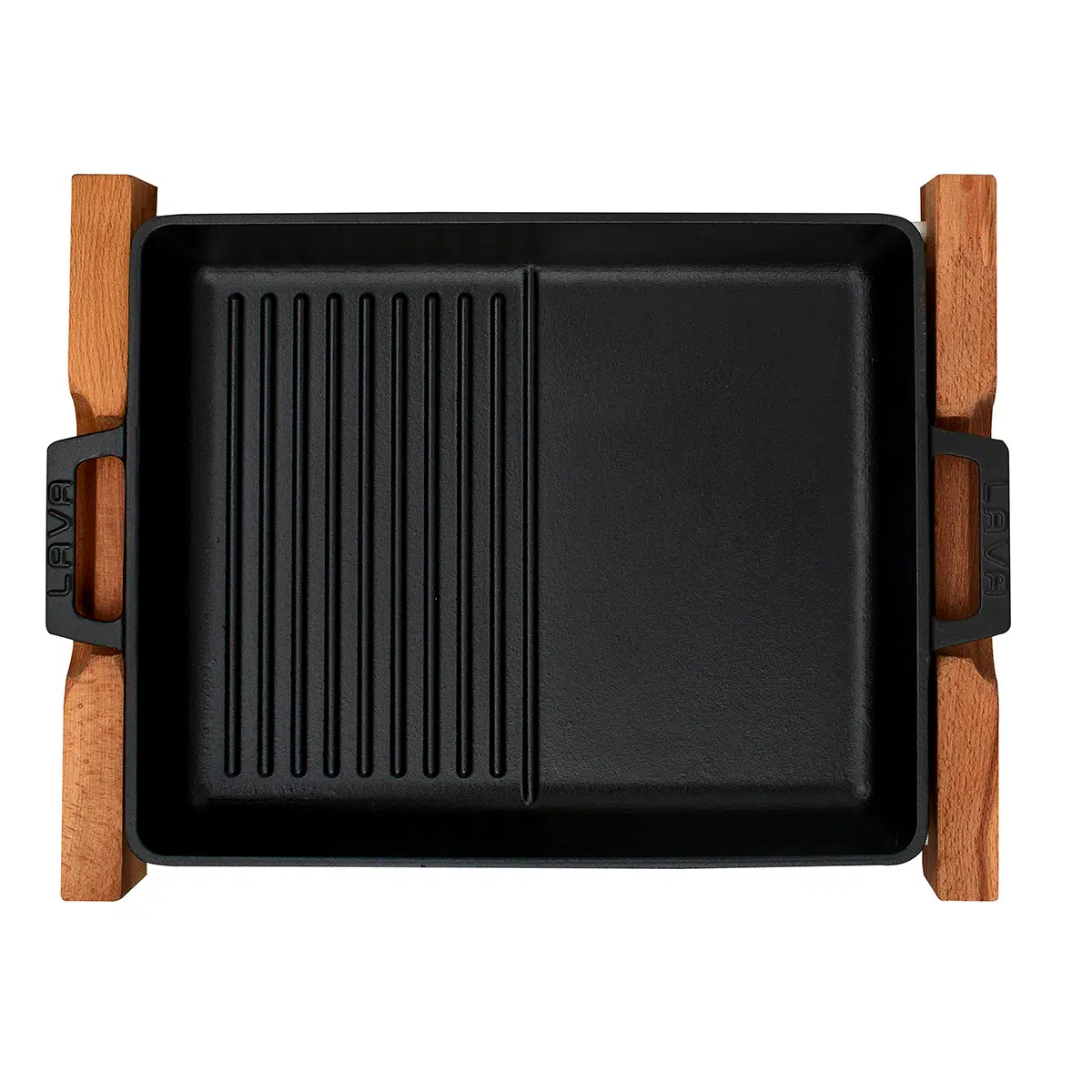 LAVA Döküm Hibrit Izgara Tava ile aynı anda hem ızgara hem de kızartma yapabilirsiniz. Bir yanda ağız sulandıran ızgara et ve balık hazırlarken kızartma bölümünde de yaratıcı garnitürler hazırlayarak zamandan tasarruf edebilirsiniz. Yüksek ısı dayanıklılığına ve ısı tutma özelliği sayesinde, LAVA Döküm Izgara Tava'nın kayın ahşap standı ile uzun süre sıcak kalacak paylaşımlık sunumlar hazırlayabilirsiniz.