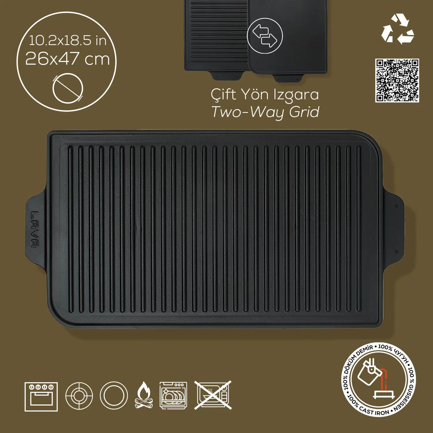 LAVA Döküm Griddle ile şık ve efektif sunumlar, artık çok kolay! Yüksek ısı dayanıklılığına ve uzun süre ısı tutma özelliğine sahip LAVA Döküm Griddle ile ister ızgara yüzeyinde mangal lezzetinde yemekler hazırlayın ister düz yüzeyinde ağız sulandıran kızartmalar. Uzun süre sıcak kalacak sunumlar ile profesyonelliği masanıza taşıyın.