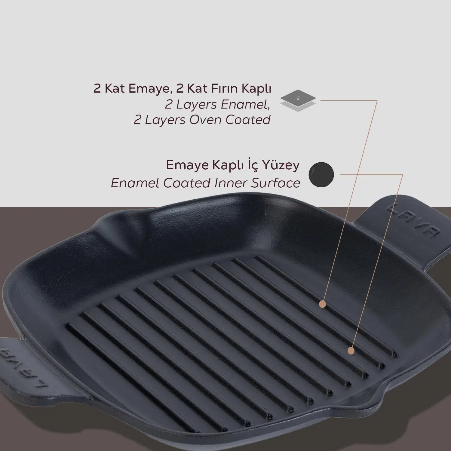 LAVA Döküm Izgara Tava’nız, mühürleme yöntemi ile sizi ağız sulandıran yemeklerle buluştururken, istenmeyen su salınımını önleyerek besin değerlerinin kaybolmasını engeller. %100 geri dönüştürülebilir ve kanserojen içermeyen LAVA’nız, sağlıklı yaşam ve sürdürülebilir bir çevre için mutfağınızda atabileceğiniz bir adımdır.
