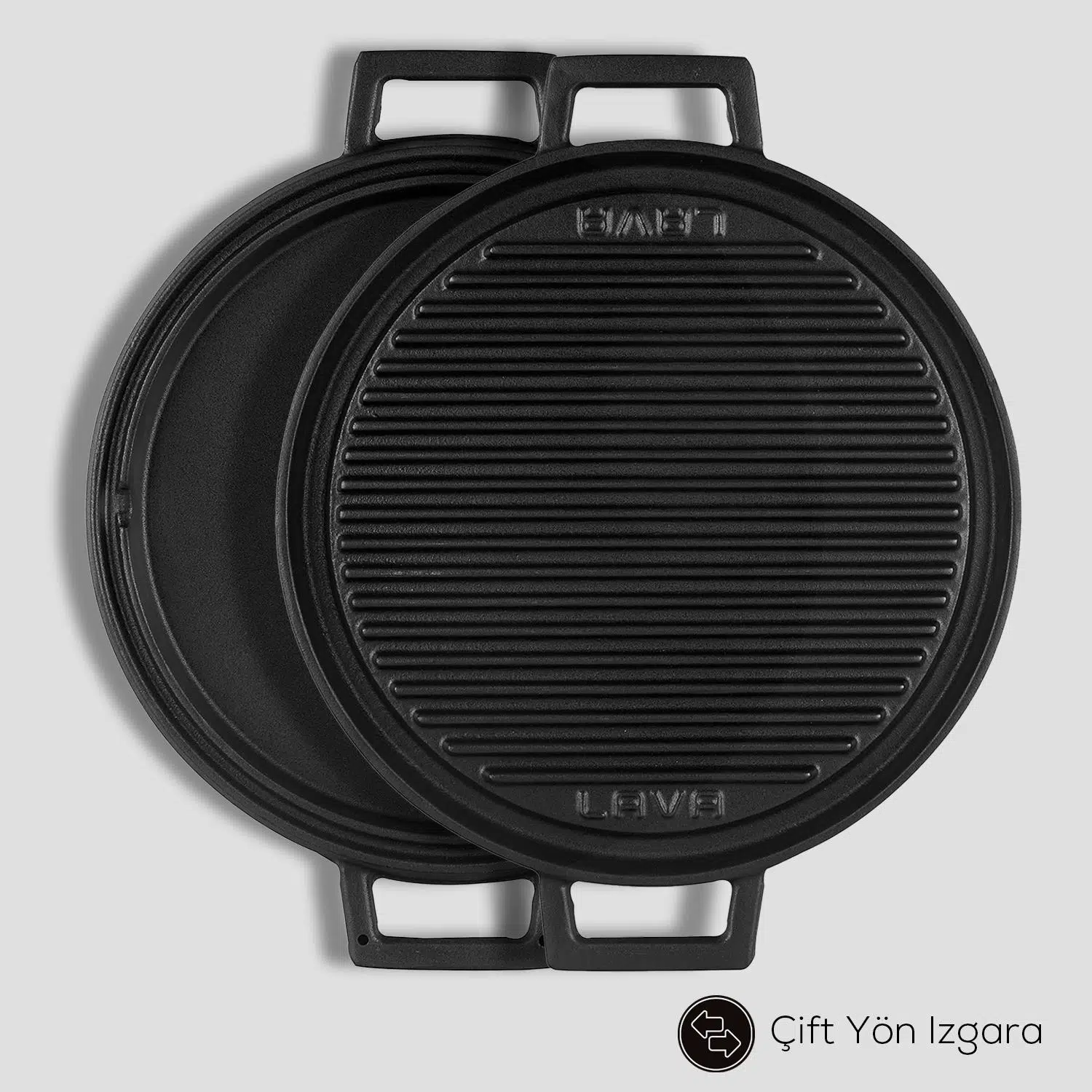 LAVA Döküm Çift Yön Izgara Tavası ile kızartma ve ızgara bir arada! İster düz yüzeyinde tadı damağınızda kızartmalar veya soteler yapın ister ızgara yüzeyinde mangal tadında yemeklere ulaşın. Çok amaçlı kullanımı sayesinde hem yerden hem de cepten tasarruf edin!