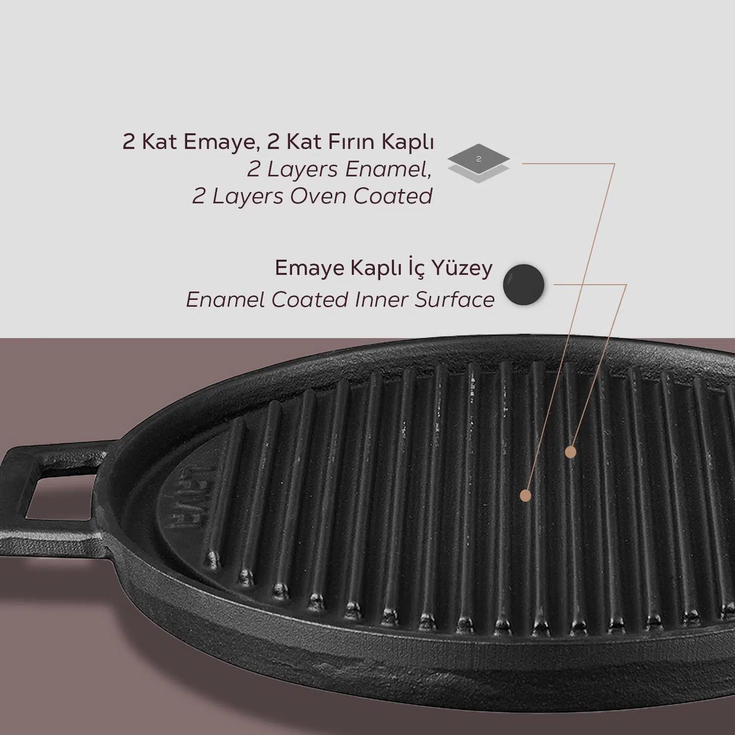 LAVA Döküm Izgara Tava’nız, mühürleme yöntemi ile sizi ağız sulandıran yemeklerle buluştururken, istenmeyen su salınımını önleyerek besin değerlerinin kaybolmasını engeller. %100 geri dönüştürülebilir ve kanserojen içermeyen LAVA’nız, sağlıklı yaşam ve sürdürülebilir bir çevre için mutfağınızda atabileceğiniz bir adımdır.