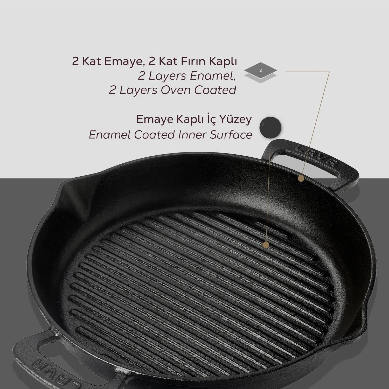 LAVA Döküm Yuvarlak Izgara Tava’nız, mühürleme yöntemi ile sizi ağız sulandıran yemeklerle buluştururken, istenmeyen su salınımını önleyerek besin değerlerinin kaybolmasını engeller. %100 geri dönüştürülebilir ve kanserojen içermeyen LAVA’nız, sağlıklı yaşam ve sürdürülebilir bir çevre için mutfağınızda atabileceğiniz bir adımdır.