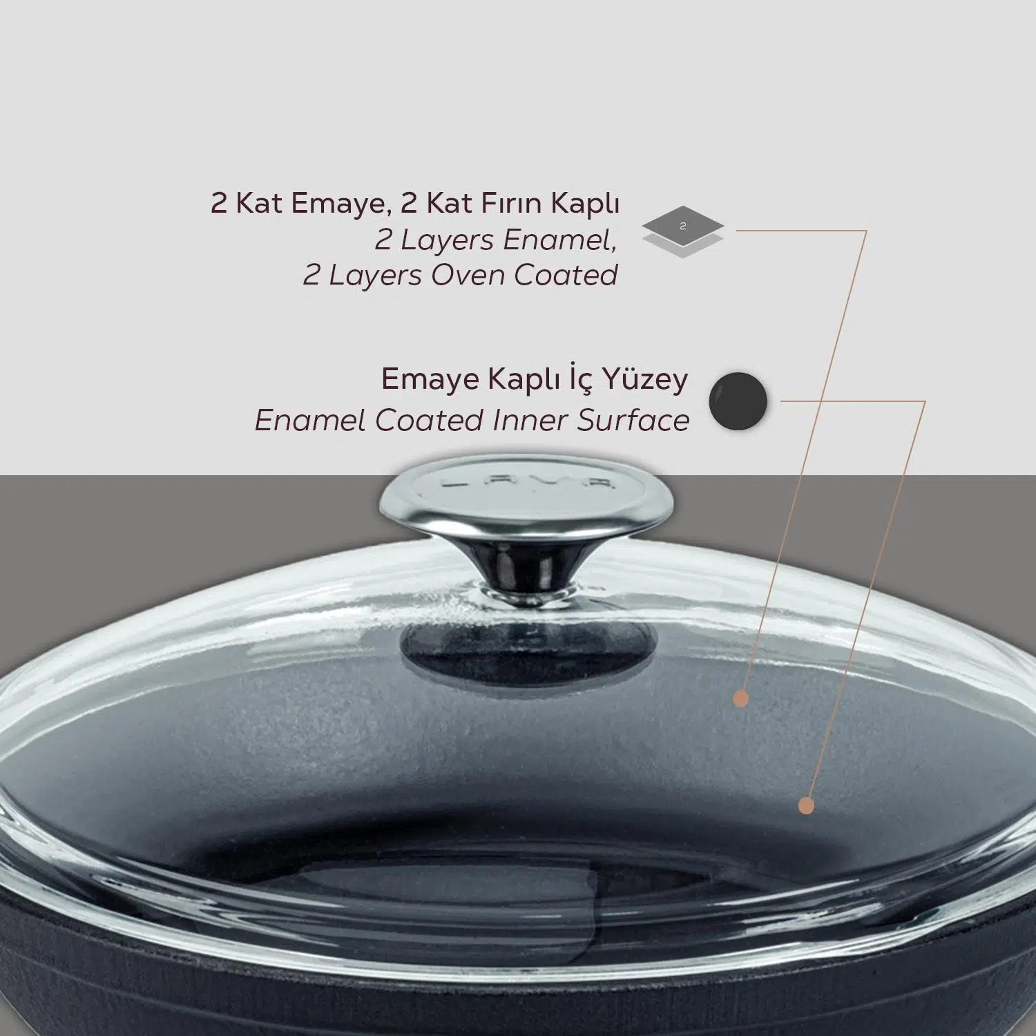 Etiketler | Lava Döküm Yuvarlak Sahan Cam Kapaklı Döküm Demir Yekpare Çift Kulplu Çap(Ø)24cm. |